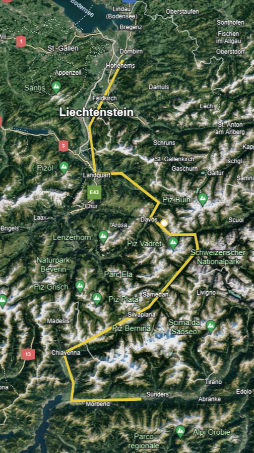 Starting in a southerly direction, I flew over Hohemems and Rankweil into Liechtenstein. Following the valley after Vaduz into Switzerland, I had to make a sharp right turn to avoid the Silvretta mountains in front of me. I overflew the ski resort of Davos and turned left towards Flüela pass. On the right the mountains rose sharply, Sentischhorn being the highest. I just made it over the pass (2383m) and as I cruised down again I passed Piz Linard on the left.