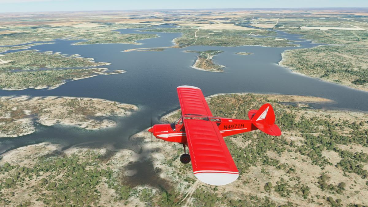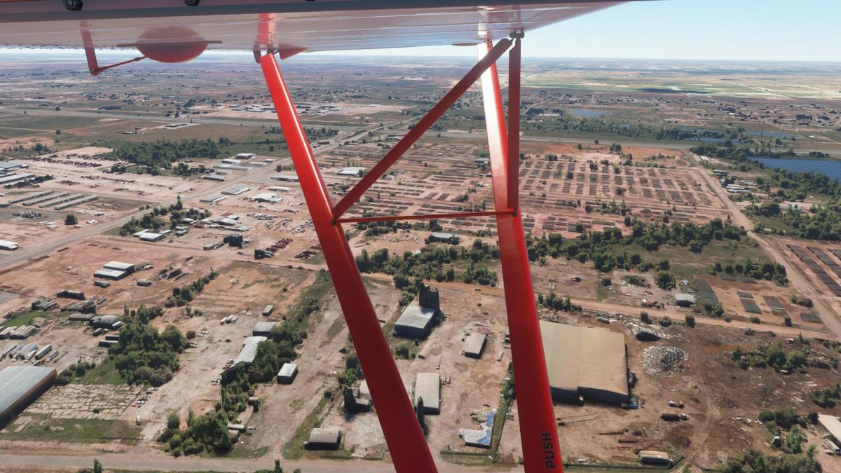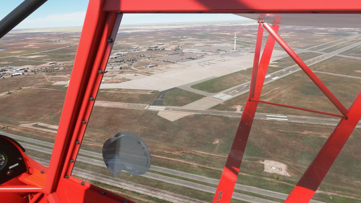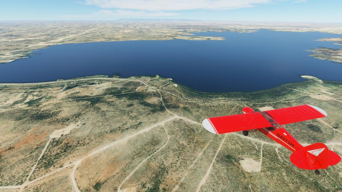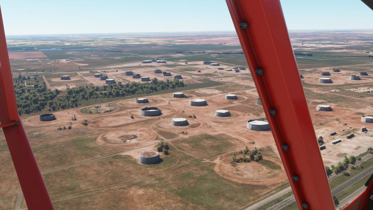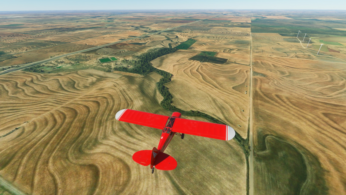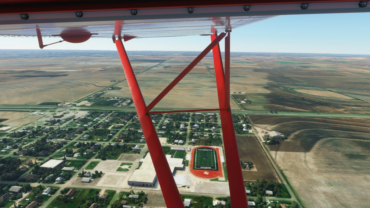 Nun wird vollgetankt. Es sind zwar nur 45mins bis nach Big Spring, aber ich wollte testen wie sich die Maschine mit vollen Tanks verhält. Der Start klappt problemlos und ich fliege wieder die I-20 entlang. Wo ich mich befinde, lässt sich anhand der Footballfelder leicht ausmachen. 1. Station: Roscoe, die Heimat der Flowboys. Dann wieder viele Windräder und kurz vor Colorado (hier sind die Wolves zu Hause) ändert sich die Landschaft schlagartig. Vorbei am Lake Colorado ist es danach nun wieder grün bis nach Big Spring (hier spielen die Steers).