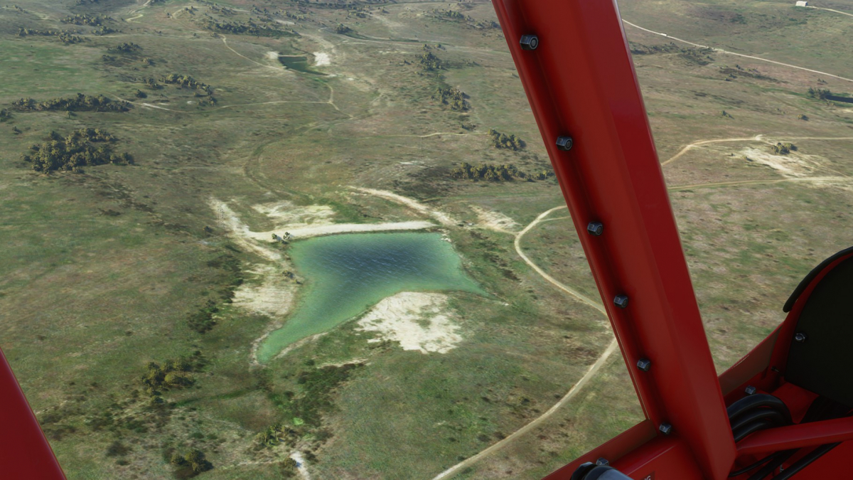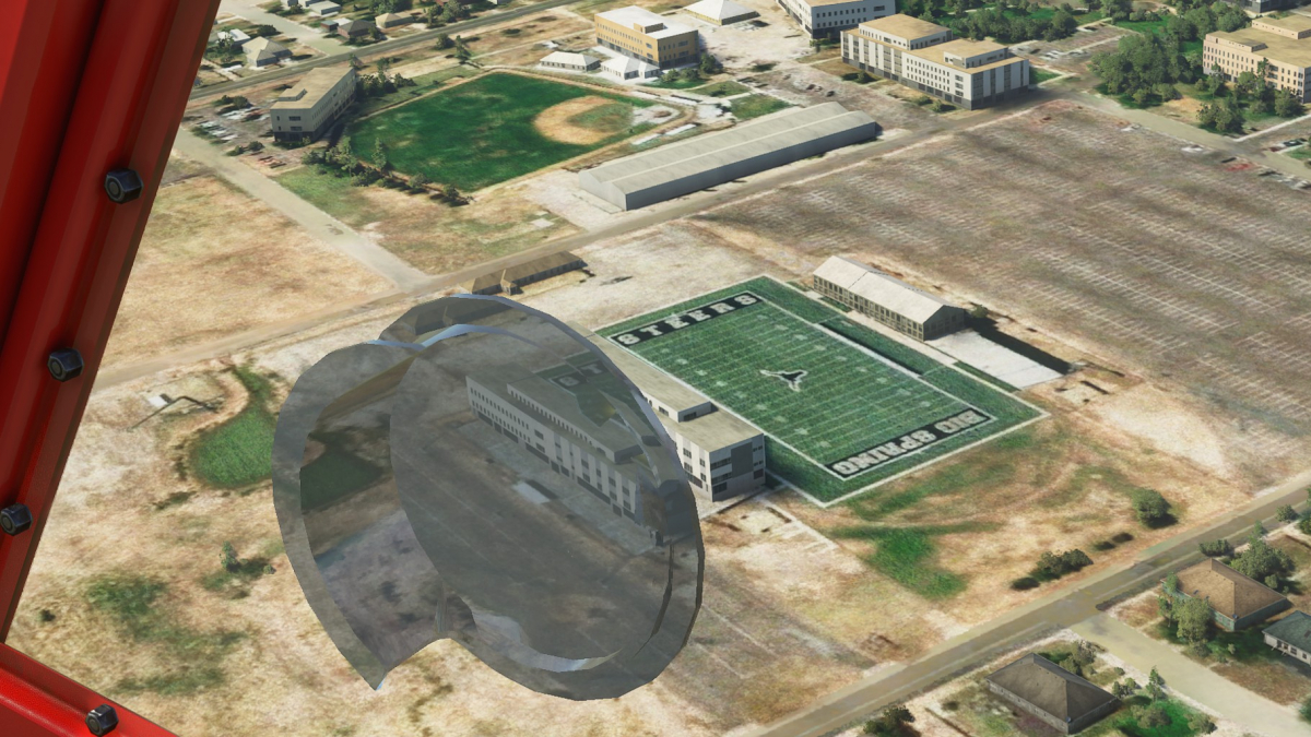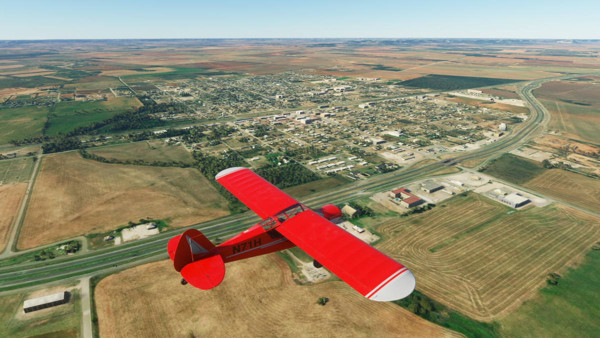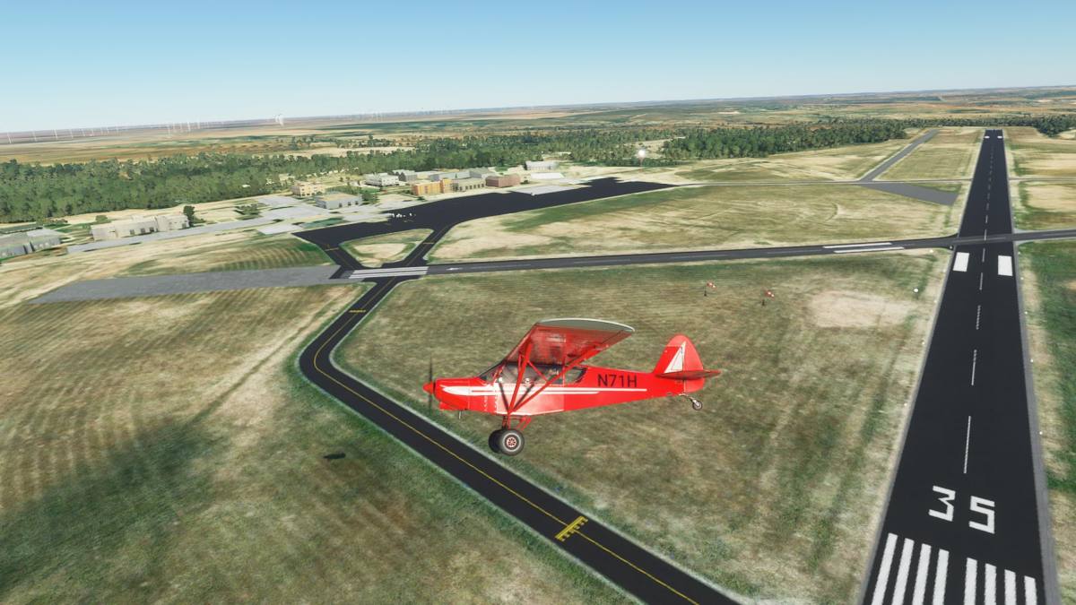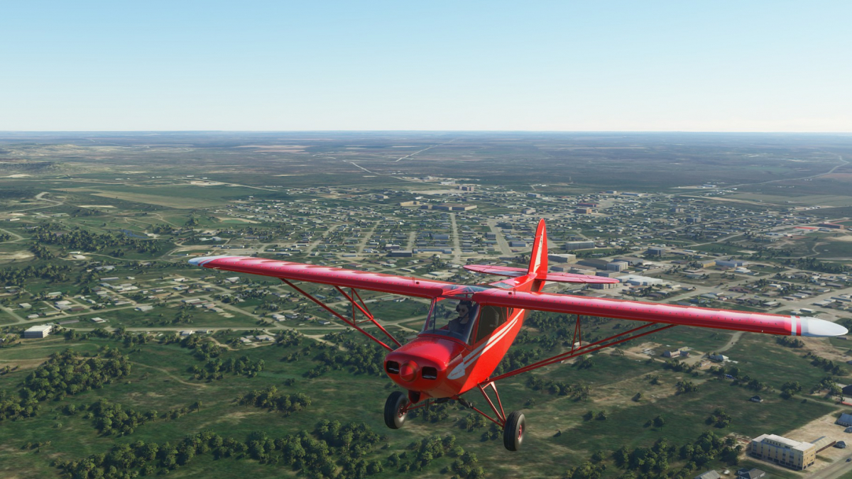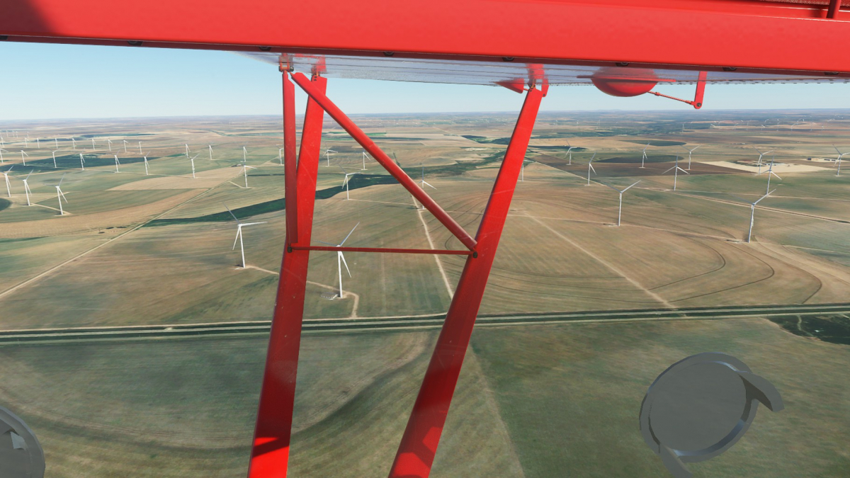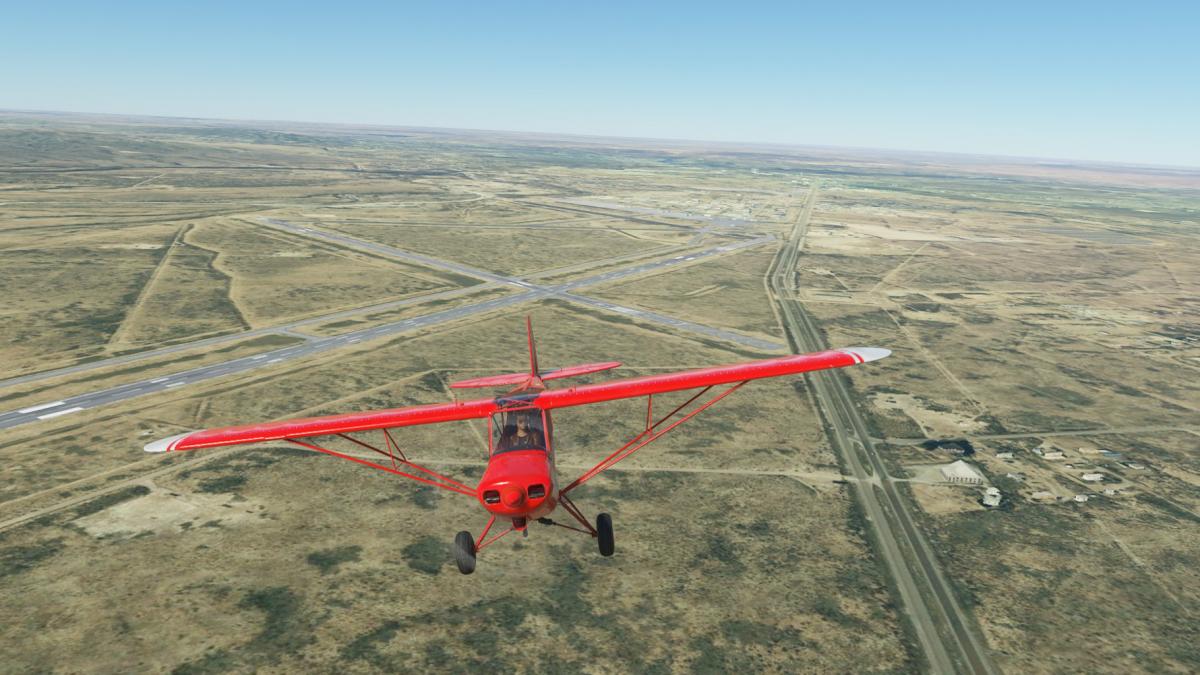 Nun wird vollgetankt. Es sind zwar nur 45mins bis nach Big Spring, aber ich wollte testen wie sich die Maschine mit vollen Tanks verhält. Der Start klappt problemlos und ich fliege wieder die I-20 entlang. Wo ich mich befinde, lässt sich anhand der Footballfelder leicht ausmachen. 1. Station: Roscoe, die Heimat der Flowboys. Dann wieder viele Windräder und kurz vor Colorado (hier sind die Wolves zu Hause) ändert sich die Landschaft schlagartig. Vorbei am Lake Colorado ist es danach nun wieder grün bis nach Big Spring (hier spielen die Steers).