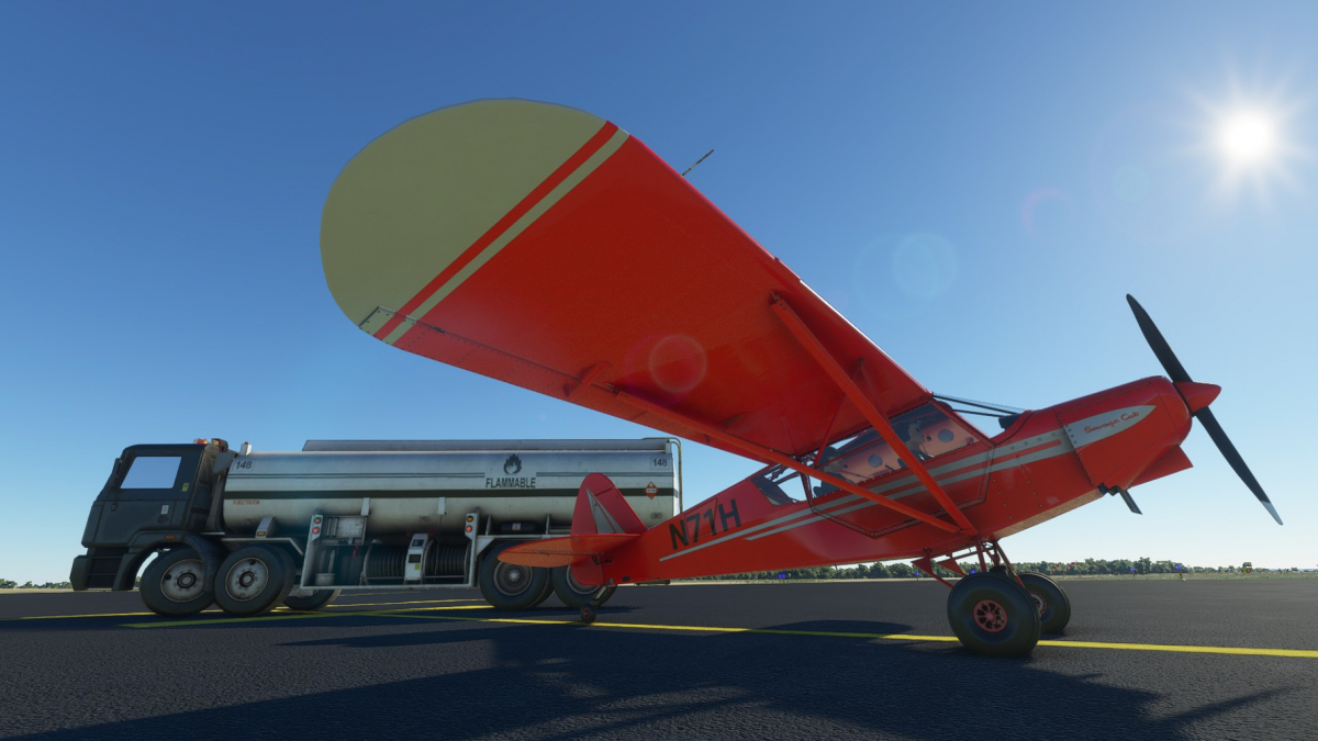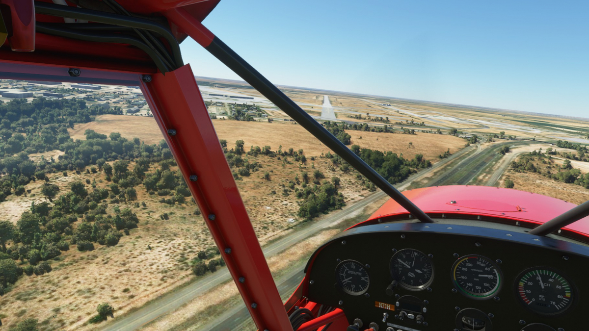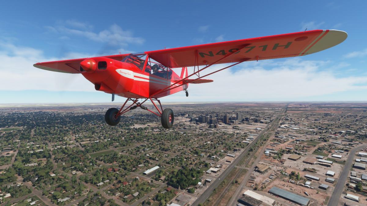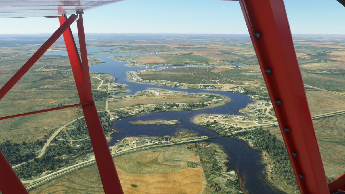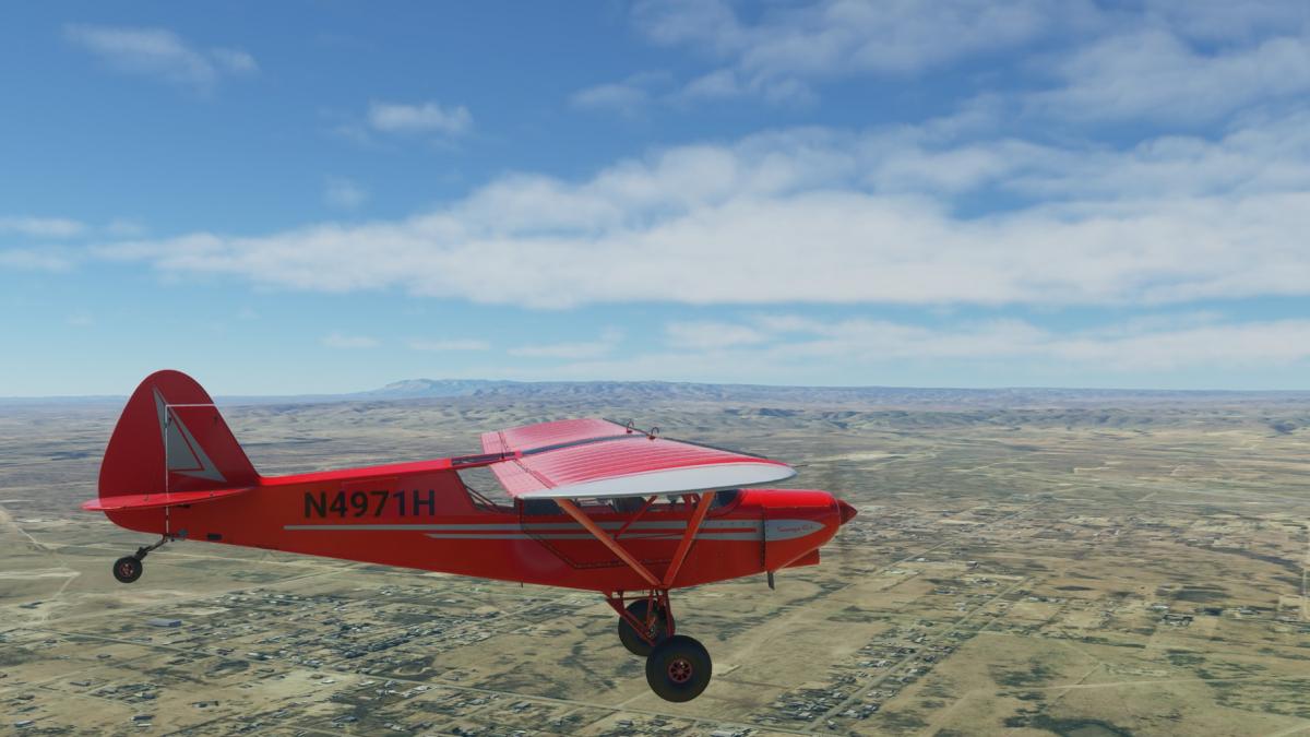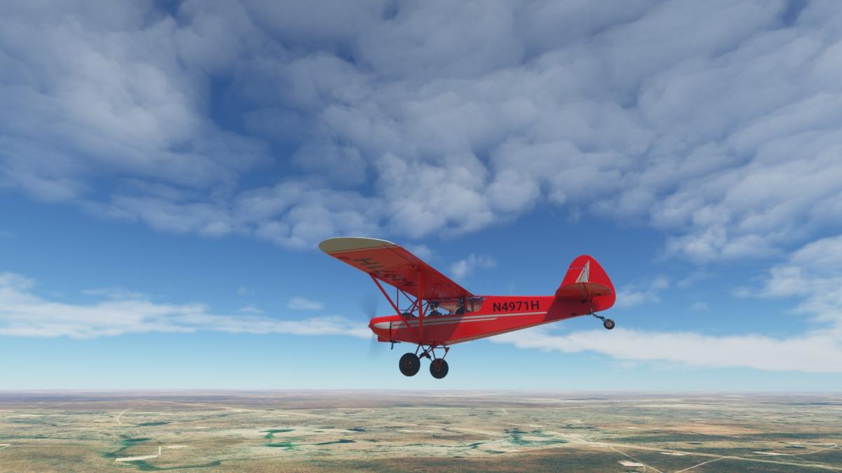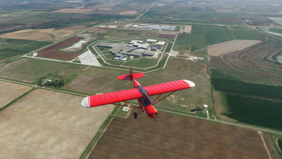 Nun wird vollgetankt. Es sind zwar nur 45mins bis nach Big Spring, aber ich wollte testen wie sich die Maschine mit vollen Tanks verhält. Der Start klappt problemlos und ich fliege wieder die I-20 entlang. Wo ich mich befinde, lässt sich anhand der Footballfelder leicht ausmachen. 1. Station: Roscoe, die Heimat der Flowboys. Dann wieder viele Windräder und kurz vor Colorado (hier sind die Wolves zu Hause) ändert sich die Landschaft schlagartig. Vorbei am Lake Colorado ist es danach nun wieder grün bis nach Big Spring (hier spielen die Steers).