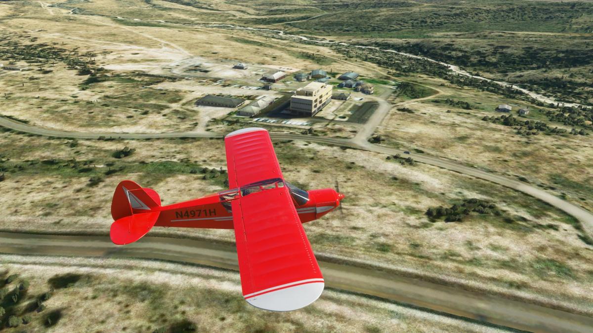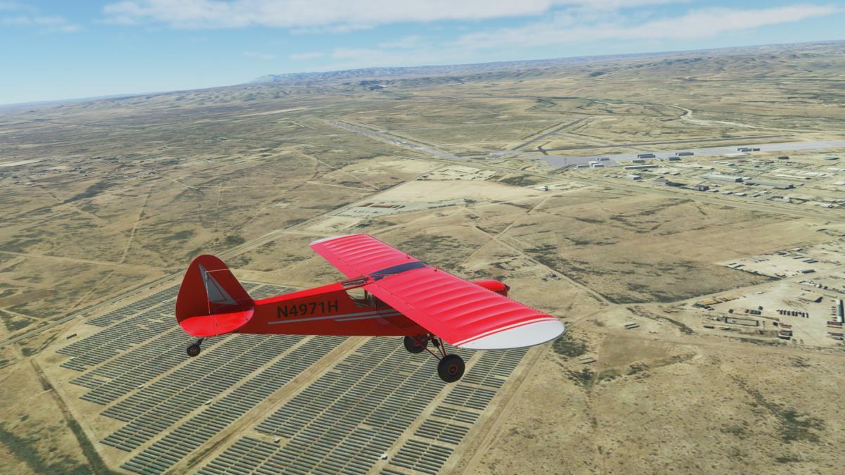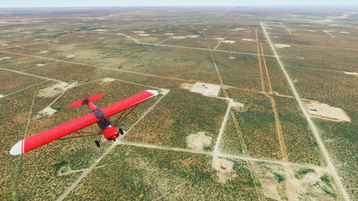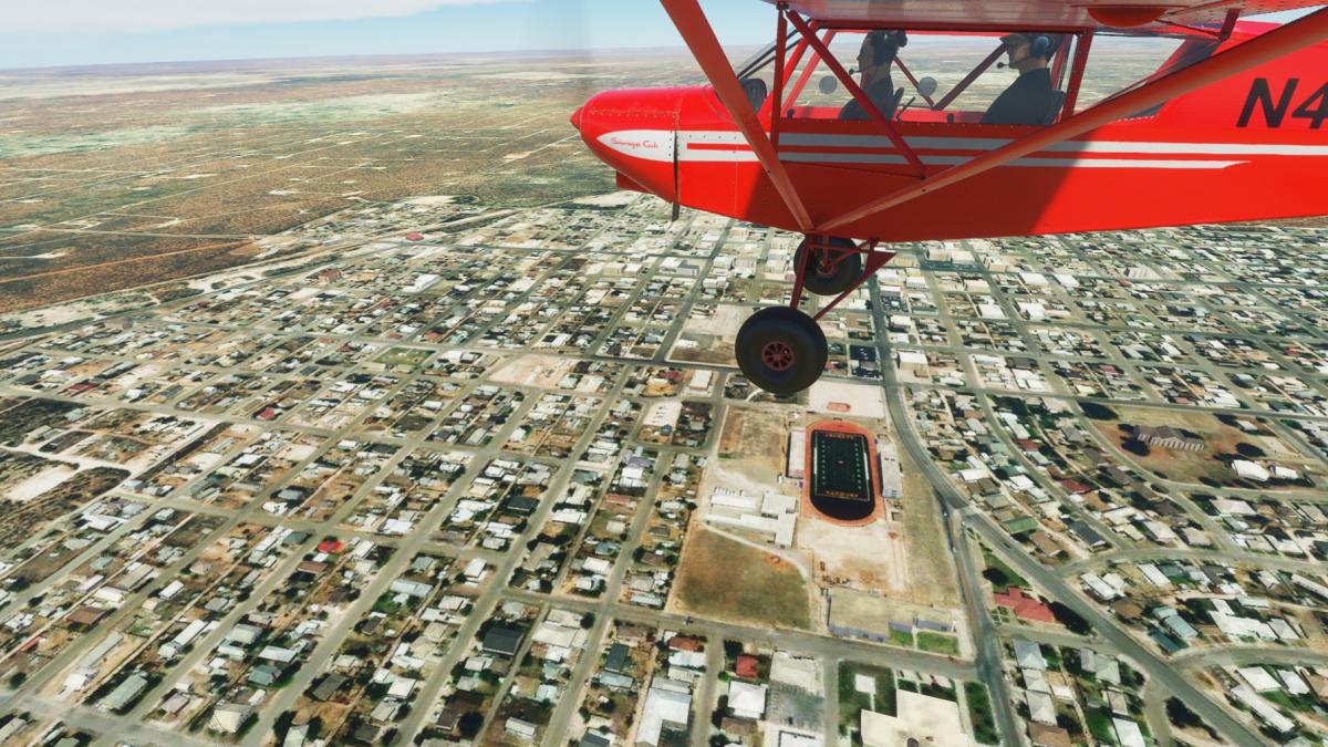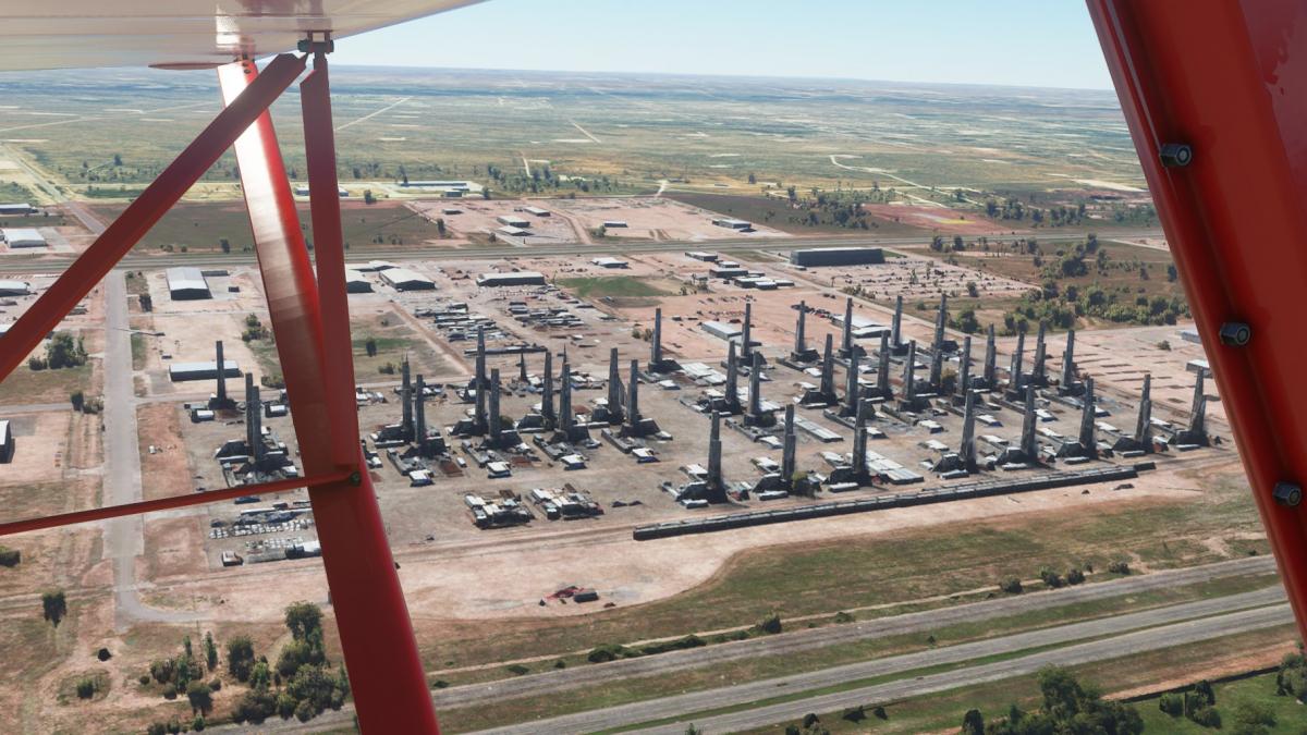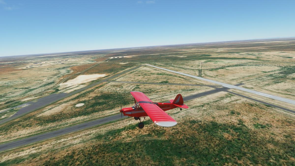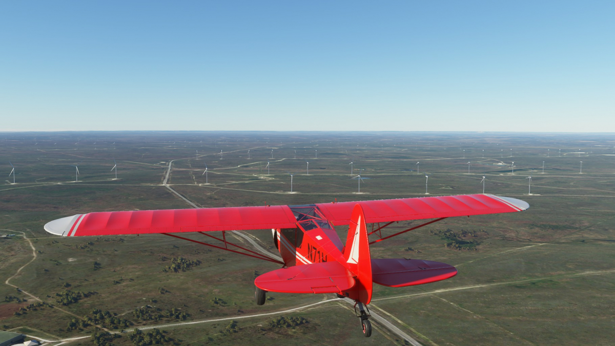 Beim Start in Albany (nun mit der korrekten Piper Cub 71-Hotel) ist noch alles grün. Ich verlasse Albany Richtung W auf dem Highway 6, schwenke aber bald über viele Windräder nach Süden Richtung Abilene. Am Weg dorthin taucht ein eigenartiges Gebäude auf, gesichert wie Fort Knox. Später wird klar, es handelt sich um die French Robertson & die John Middleton Unit, beides Strafvollzugsanstalten. In Abilene biege ich wieder nach Westen entlang der Interstate 20. Zuerst an Merkel vorbei, dann endlich Sweetwater. Am Stadion (Mustang Bowl) vorbei in den Flughafen hinein.