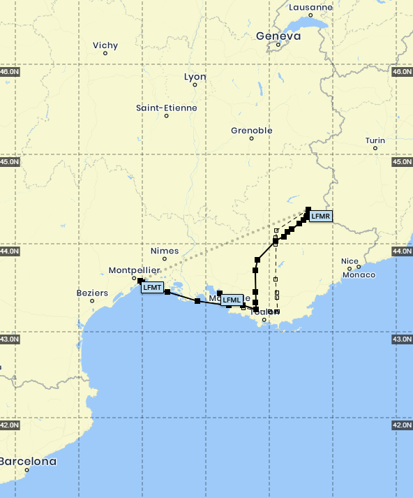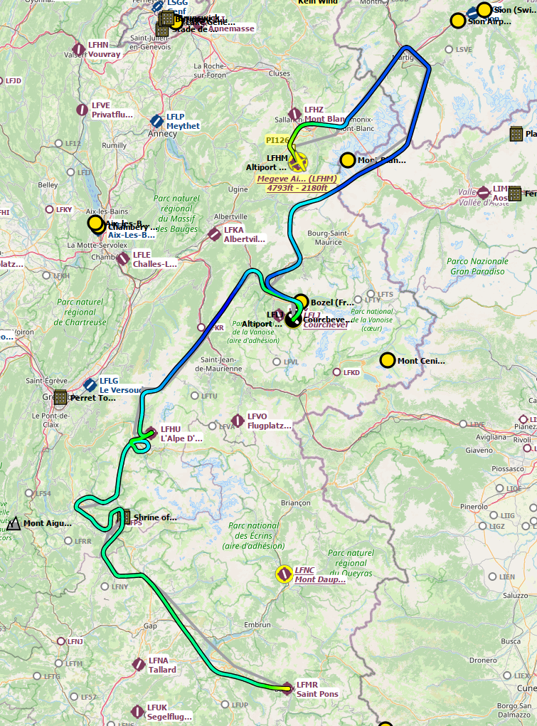 This bush trip is one of the defaults in Microsoft Flight Simulator. The – close to 900nm long – route starts in Bordeaux and ends with a flight around Mont Blanc. The trip runs along the Atlantic coast first, then into the Pyrenees, along the Mediterranean coast up to Marseille and finally into the Alps with landing spots at famous places like Courchevel.