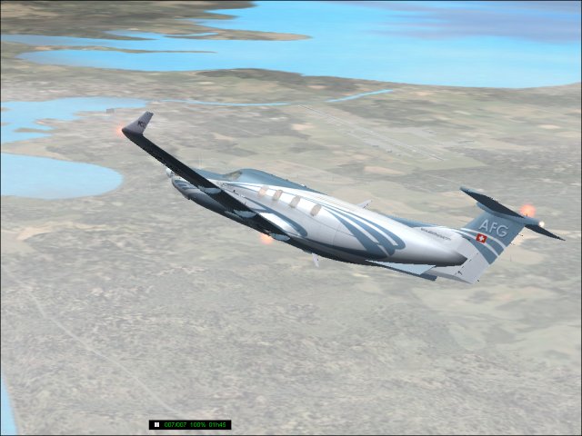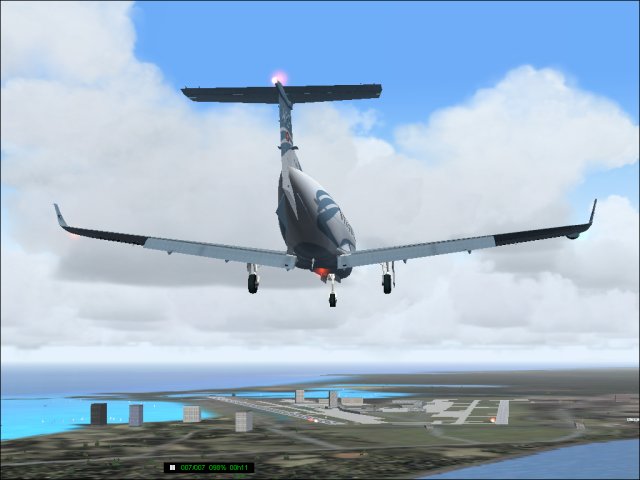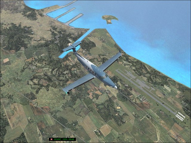 Heute gings in die USA. Der Start in Cuba war noch bei schlechten Wetter (1) und über dem Meer machte ich mir schon richtig Sorgen. Das sah einmal schwer nach Wirbelsturm aus. Dann hab ich mich über die Victor Luftstrassen nach Miami (2) getastet, über den Lake Okeechobee drüber (3) und von dort mit VOR Navigation weiter Richtung Orlando Excutive, das ist ein kleinerer Flughafen nördlich vor Orlando. Die Navigation war dann noch mal tricky, weil dorthin musste ich zuerst Orlando Intl umrunden. Runter auf 3000 Fuss und VFR fliegen, da gibts keine Luftstrassen dafür. Hat aber gut geklappt und ich kam schön am Final für Rwy07 raus (4), die Landung selbst war wie üblich mit der PC12 etwas zu weit hinten, aber ohne Probleme (5).