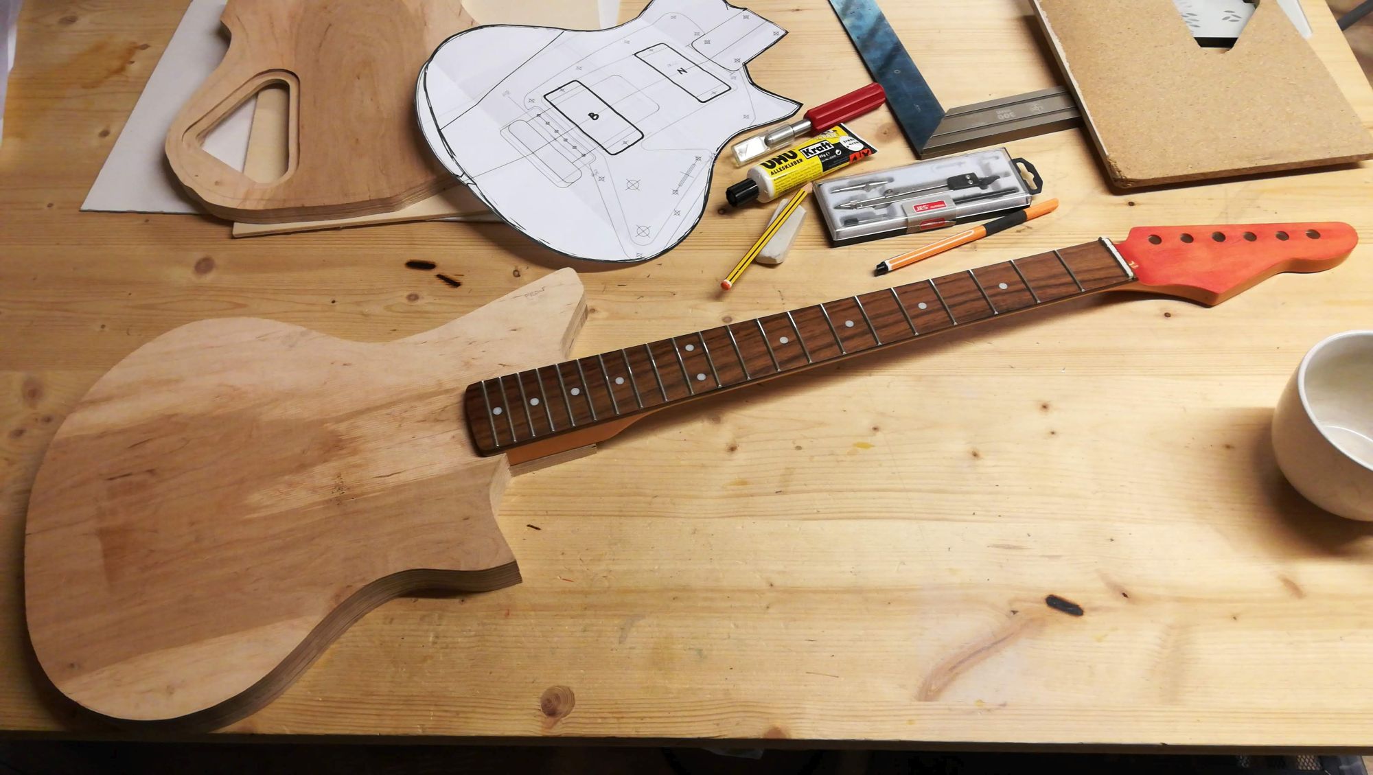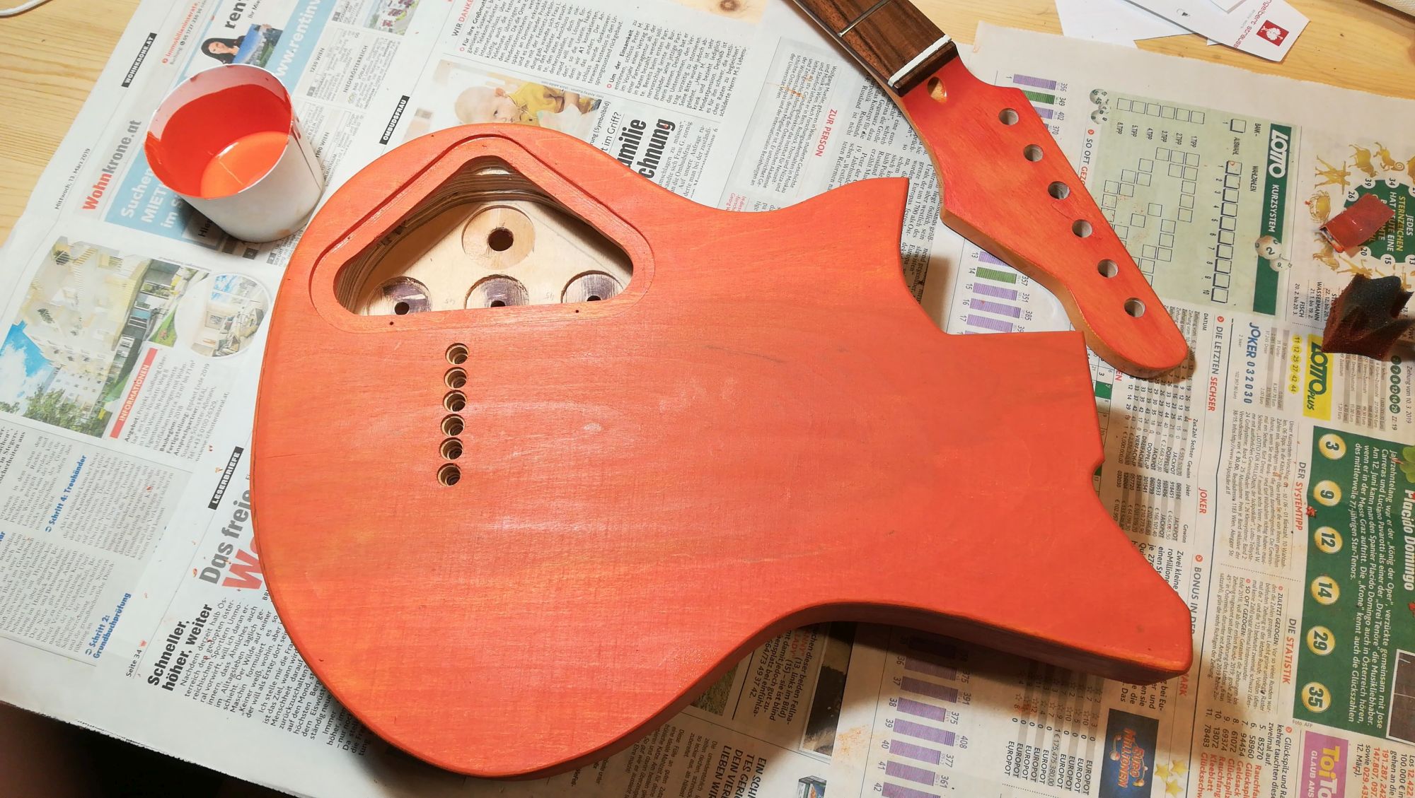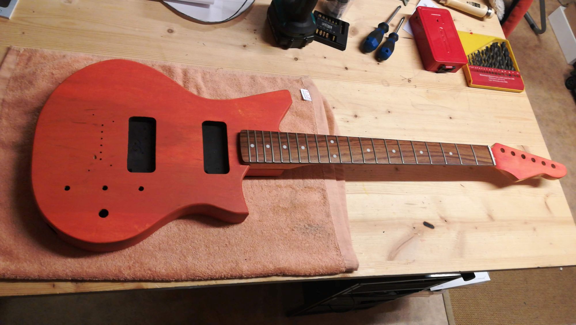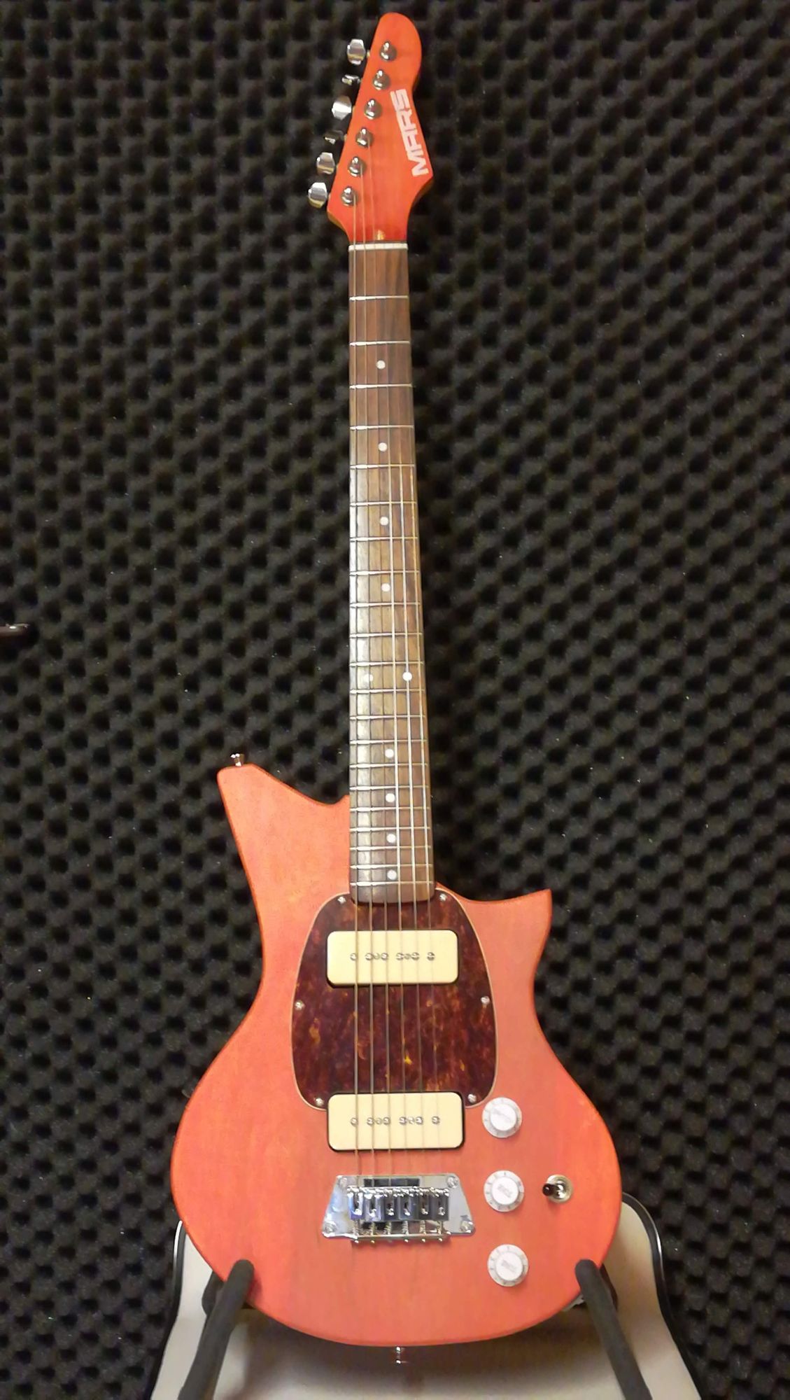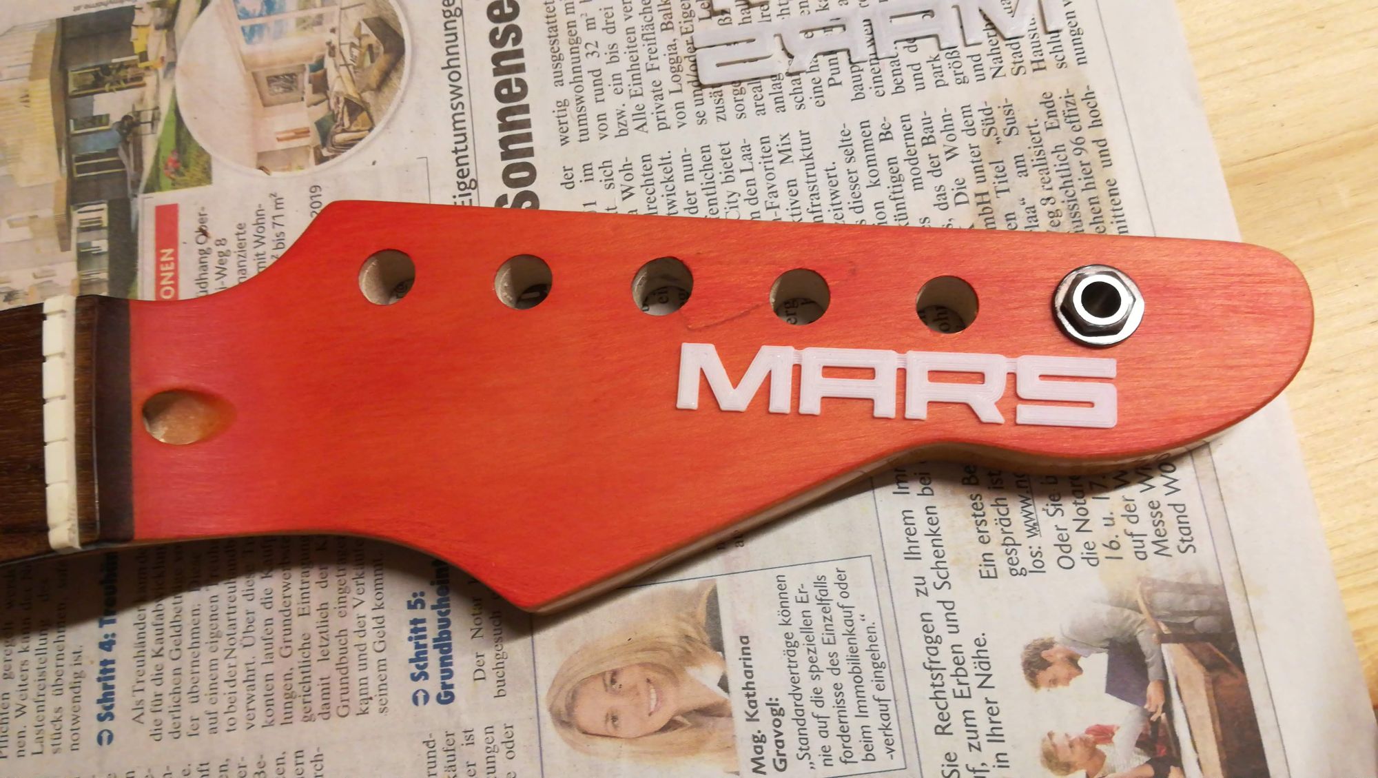 Project “Mars” So far, I had built some Workshop guitars. This one I made from scratch, only the neck was prefabricated. The body was made from birch plywood. It is a very small guitar, comparable to a music man or blueshawk.