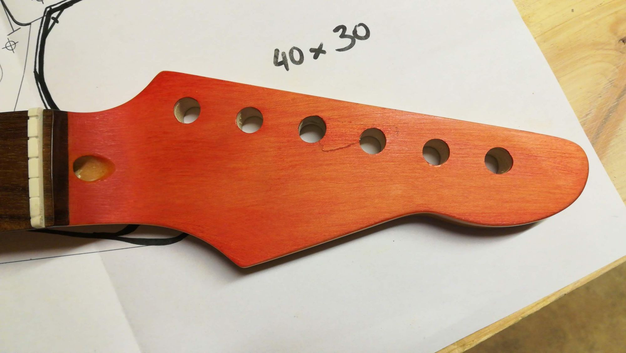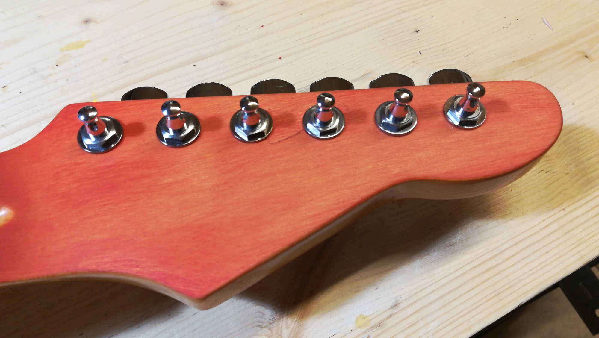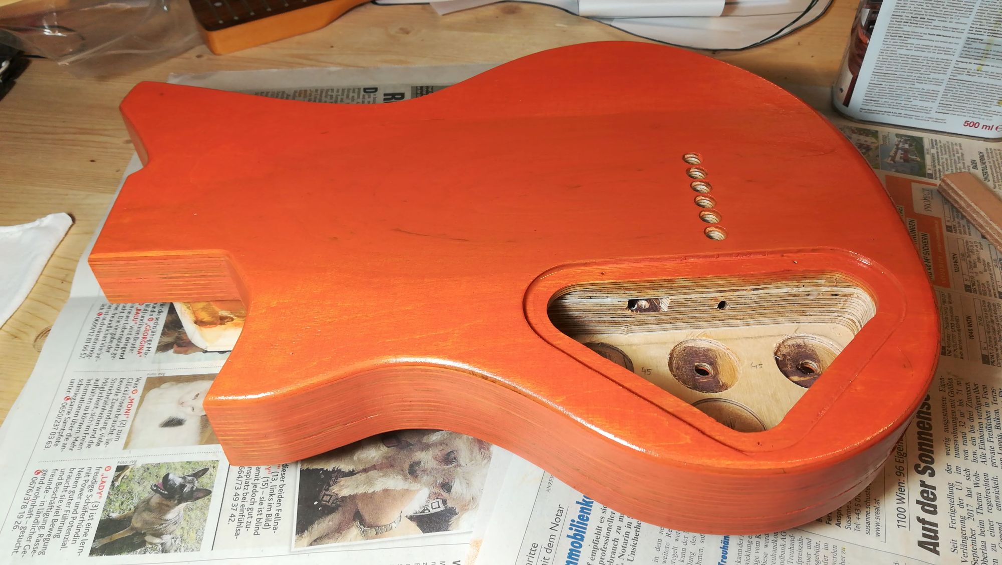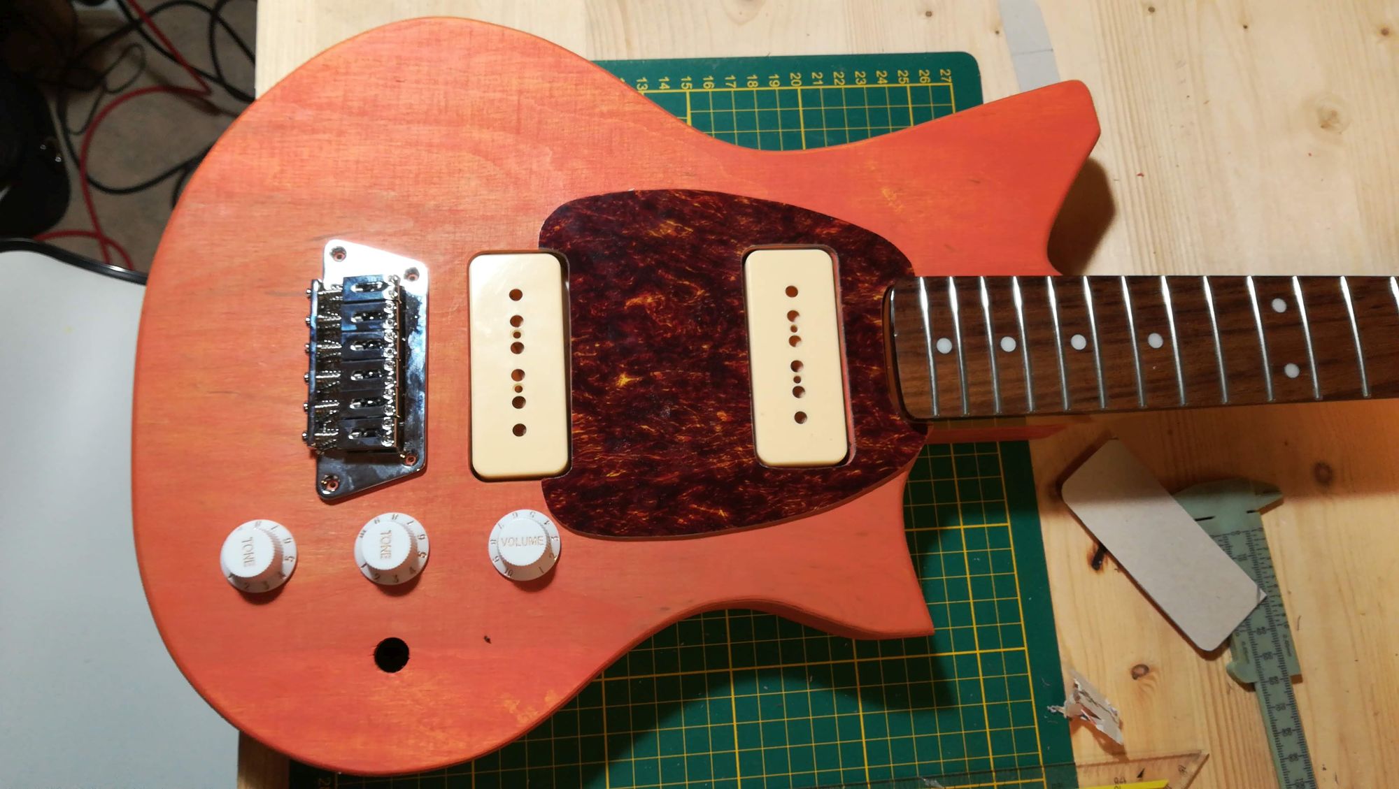 Project “Mars” So far, I had built some Workshop guitars. This one I made from scratch, only the neck was prefabricated. The body was made from birch plywood. It is a very small guitar, comparable to a music man or blueshawk.
