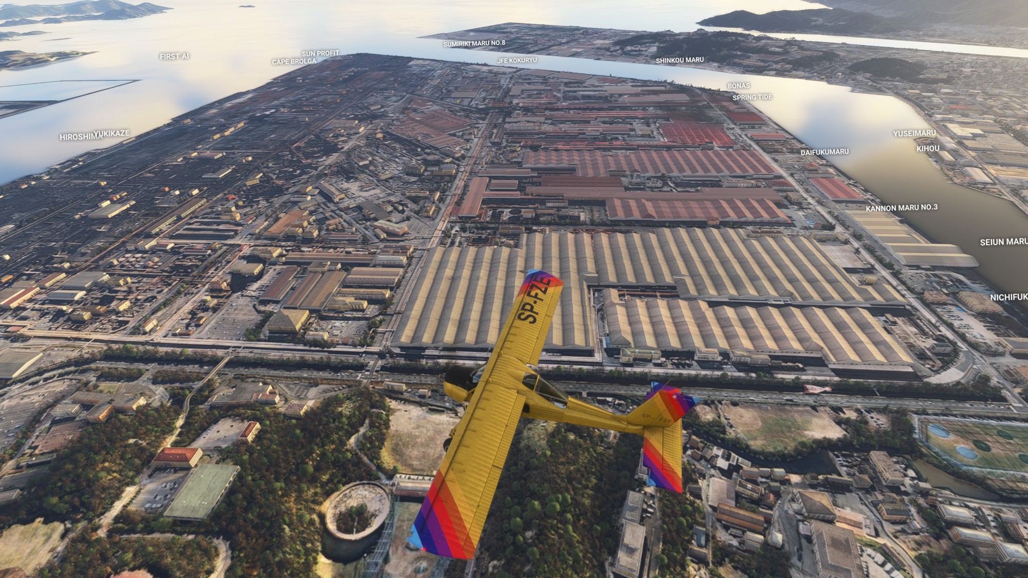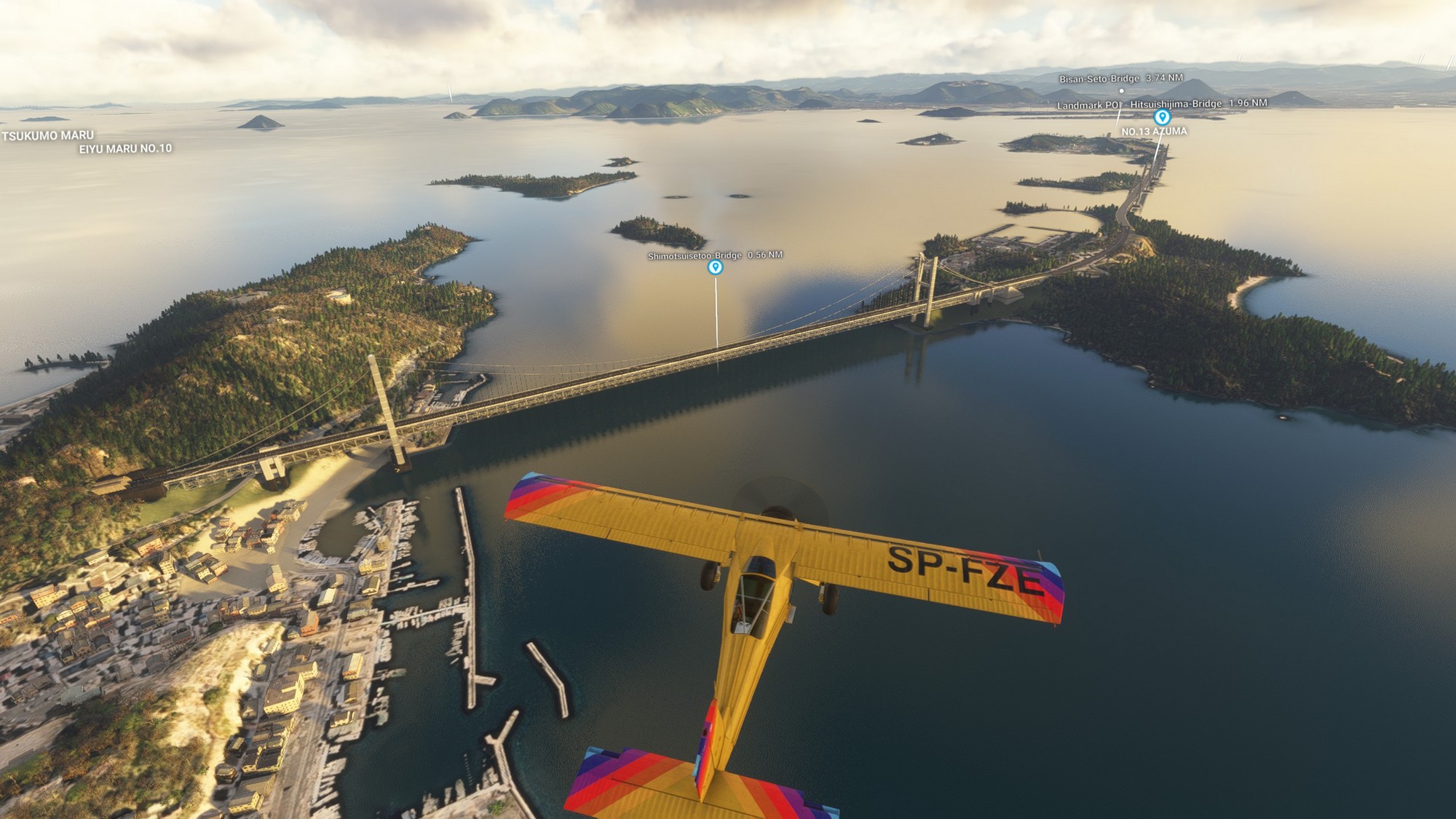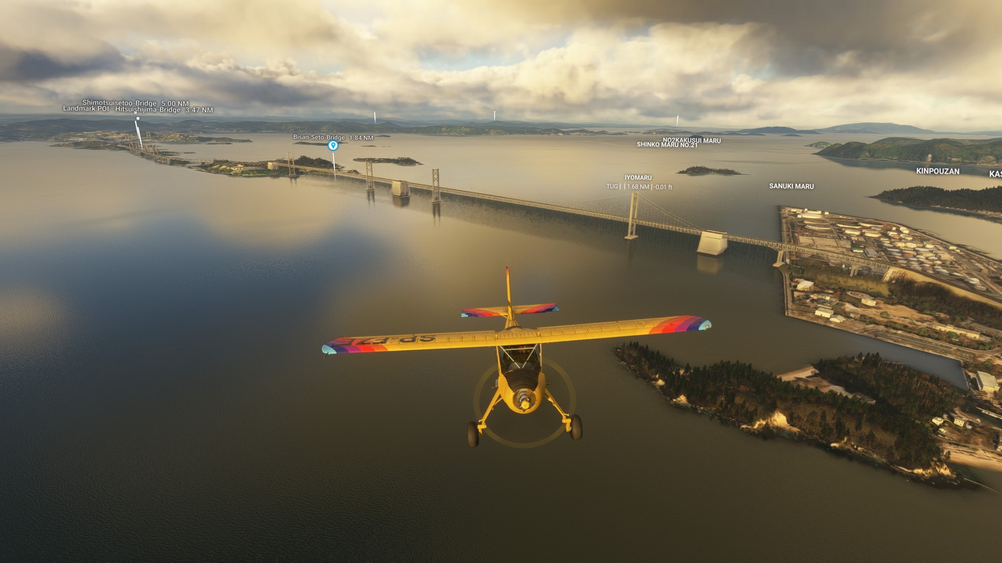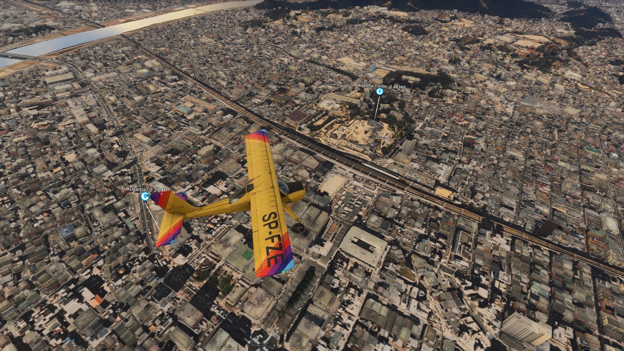 We continued along the highway towards Ikuchi bridge (forming the Nishiseto Expressway together with Tatara bridge) and then further to Fukuyama Castle. In contrast to most castles in Japan taken down during the Edo period, this one is intact. Exiting Fukuyama we passed over Kokancho harbour, greatly detailed down to the coal basins. In general, this part of Japan seems to look great in MSFS2024 with very highly detailed photgrammetry.