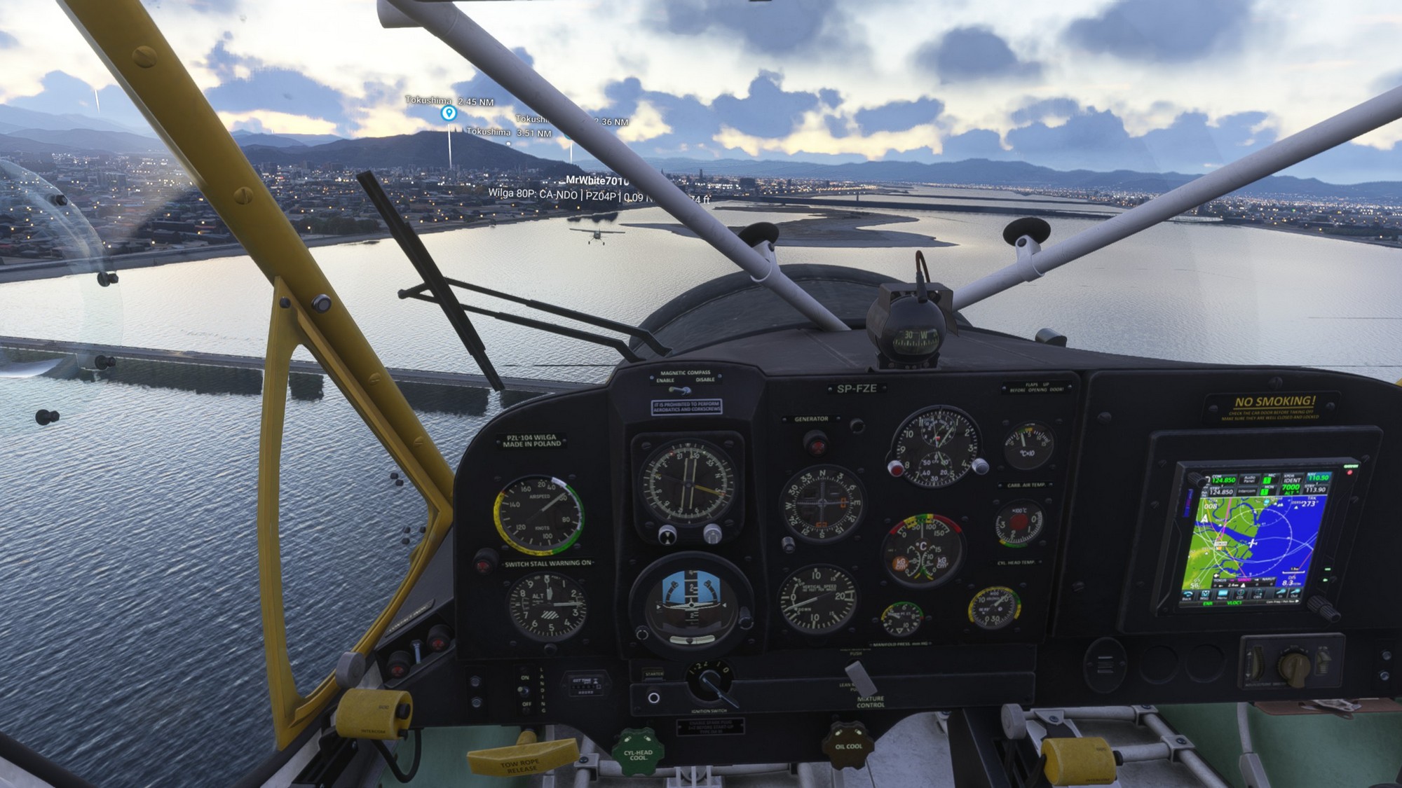 When the sun started to set, we decided to shorten our flight and land at Tokushima. We flew over Bizan Park with its oberservatory and shrine and continued towards the airport. As we crossed Yoshino river we spotted a little island in the inlet and as we were sitting in bush-planes we decided to land there for the night.